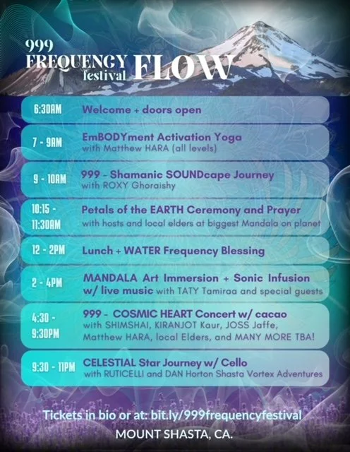 Join us for an all day festival in the majestic energies of Mount Shasta for a high-vibrational gathering on this sacred 999 portal — a powerful moment of completion, renewal, and cosmic remembrance. In numerology this brings us to a cosmic completion and the starting of higher timelines for the paradigm shift that is taking place for new earth global structures.